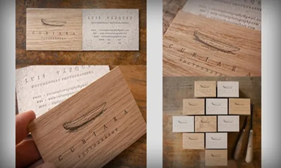종이가 아닌 다른 재료를 이용해서 질감과 느낌에 변화를 만들어 보세요. 공예품의 느낌이 나게 하려면 나무로 만들 수 있겠죠. 아니면 아크릴, 가죽, 펠트, 스웨이드, 금속 등 만졌을 때 기분이 좋은 것들을 고를 수도 있습니다. 이런 현대적인 명함들은 시각적으로 주목을 받지만, 만졌을 때의 촉감까지도 전달할 수 있습니다.