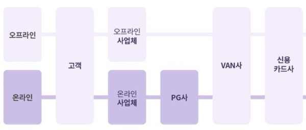 VAN사가 나와서 당황하셨나요. VAN은 Value Added Network, 부가가치통신망이라고 불립니다. 쉽게 말해 카드 결제를 위해 판매자와 카드사 사이의 망(Network)을 깔고 망 사용료를 카드사로부터 받는 회사를 말합니다. 사실 VAN사는 오프라인에서만 카드결제가 가능할 때 존재감이 더 컸습니다. 오프라인 가맹점(식당, 대형마트, 옷가게, 백화점, 시장 등)이 카드 결제를 위해선 밴사를 무조건 통해야 합니다. 카드 결제를 위해 필요한 POS단말기도 VAN사를 통해 제공받을 수 있고, 가맹점이 일일이 카드사와 계약을 맺는 게 아니라 VAN사를 통해 일괄적으로 계약을 할 수도 있습니다. 정리하자면, 카드 결제에 있어서 가맹점과 카드사 사이에서 승인·매입 처리를 하는 업체입니다.