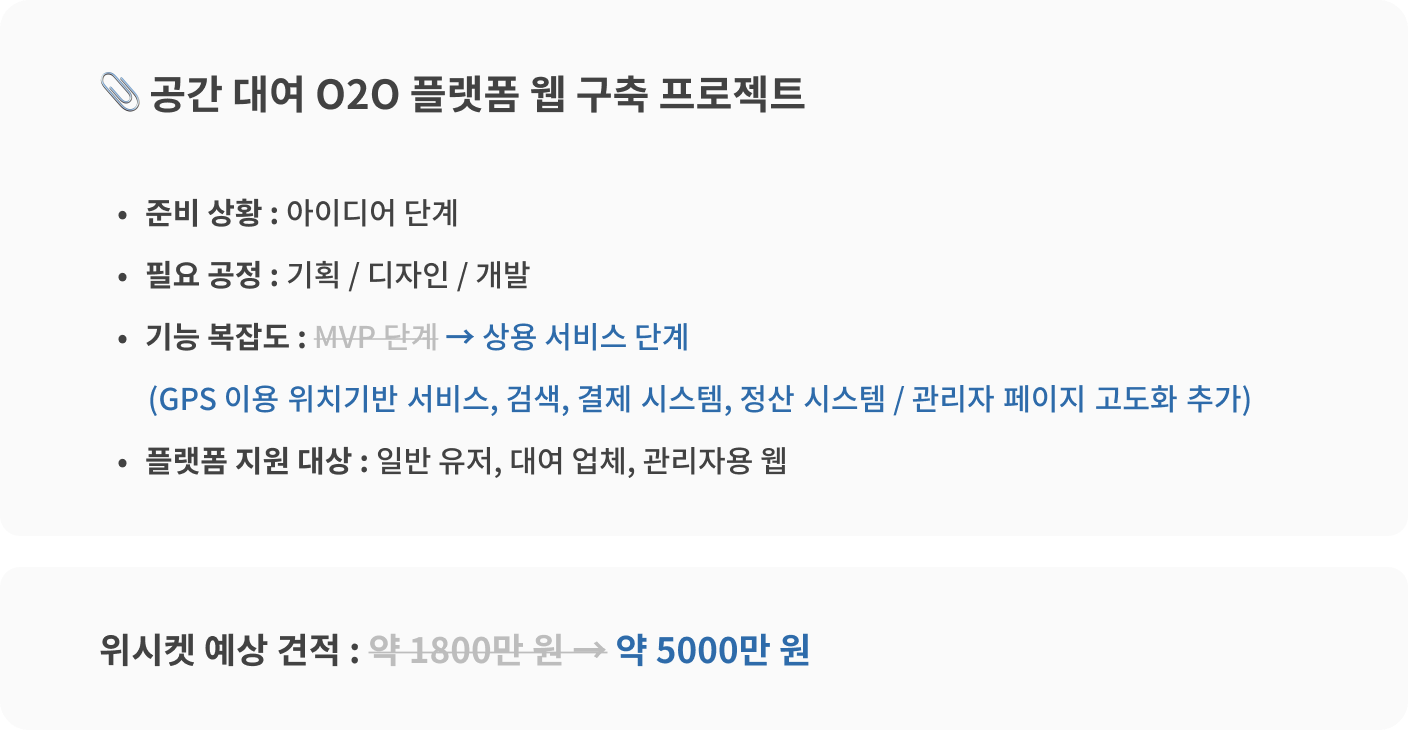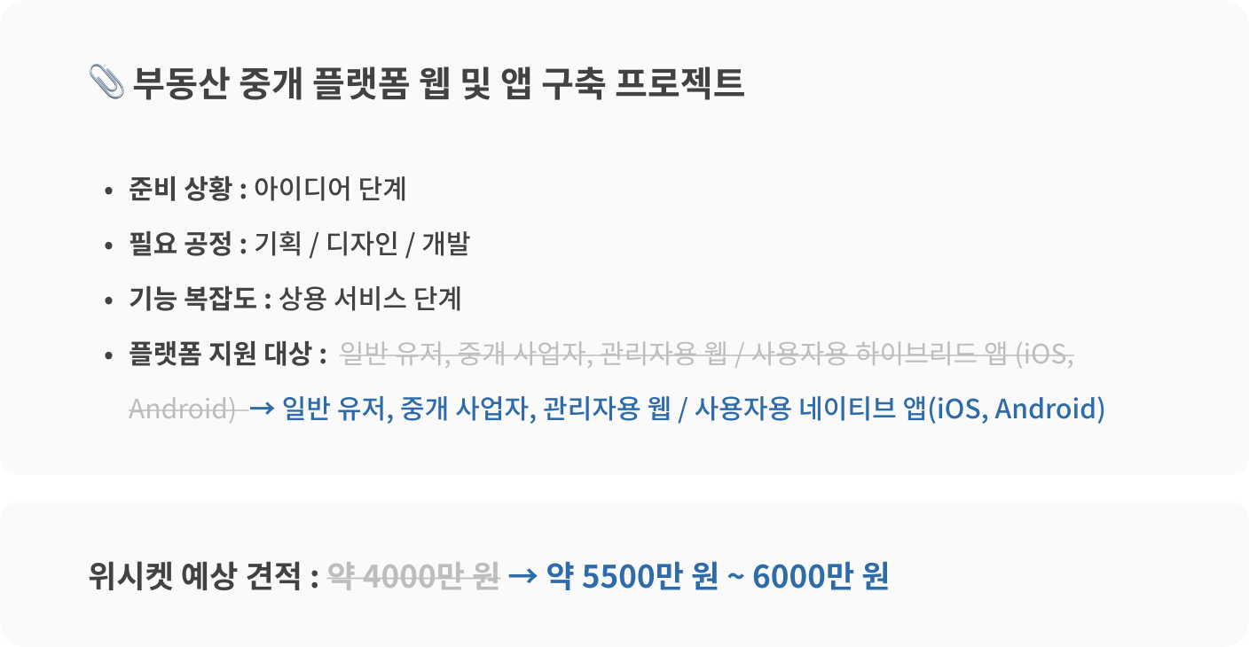 기존 프로젝트에서는 웹 구축과 각 운영 체제(iOS, 안드로이드)에 맞춘 앱 디자인, 개발 작업이 필요했는데요. 플랫폼 지원 대상에서 앱을 제외하여 업무 범위가 축소되었습니다. 그에 따라 투입해야 하는 공수도 줄어 견적이 약 1000만 원 낮게 책정되었습니다.