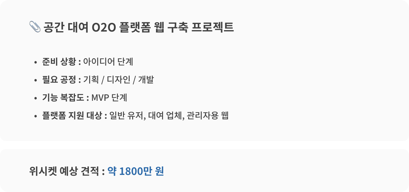 *위 콘텐츠에 소개된 견적은 IT 아웃소싱 플랫폼 위시켓에서 지원자 모집을 위해 책정한 금액이며, 실제 진행 시 변동 될 수 있습니다.