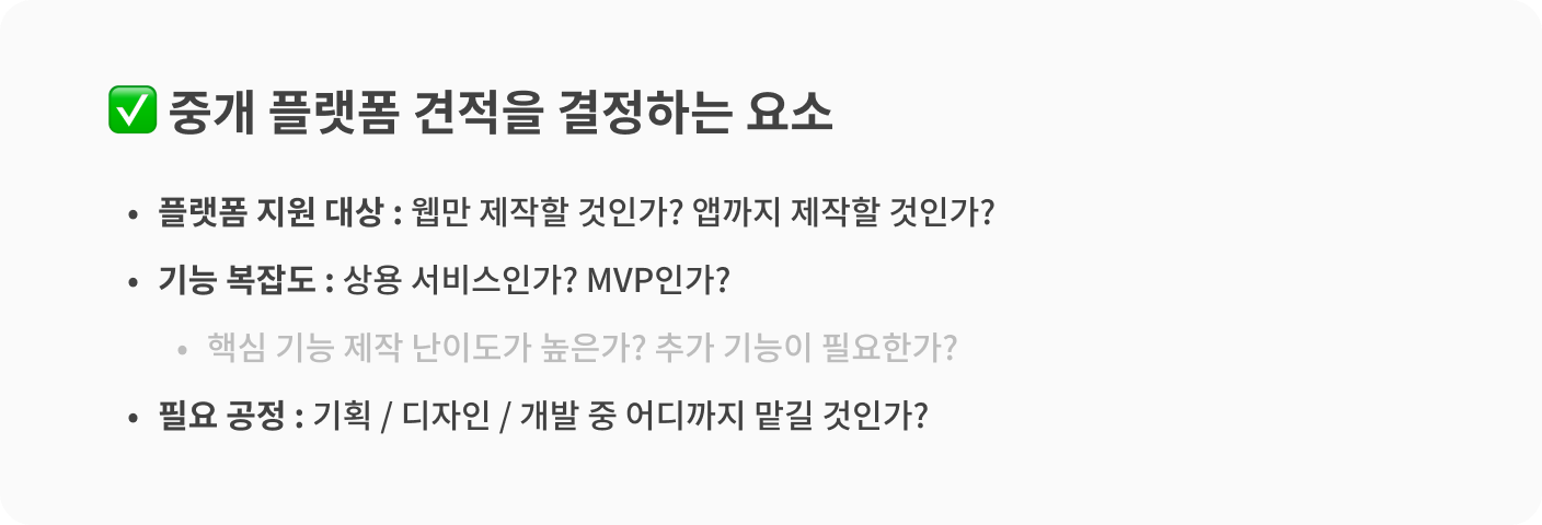 중개 플랫폼 외주 프로젝트의 업무 범위를 결정하는 요소는 크게 3가지입니다.