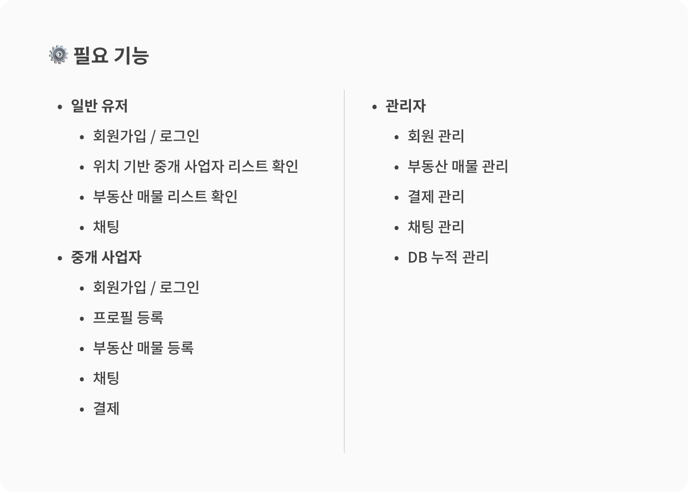 이 프로젝트는 MVP가 아닌 상용 서비스 구축이 목표였기 때문에 회원가입이나 로그인 같은 기본 기능뿐만 아니라 지역 기반 중개 사업자 검색, 견적 문의를 위한 채팅, 결제 기능이 필요했습니다.