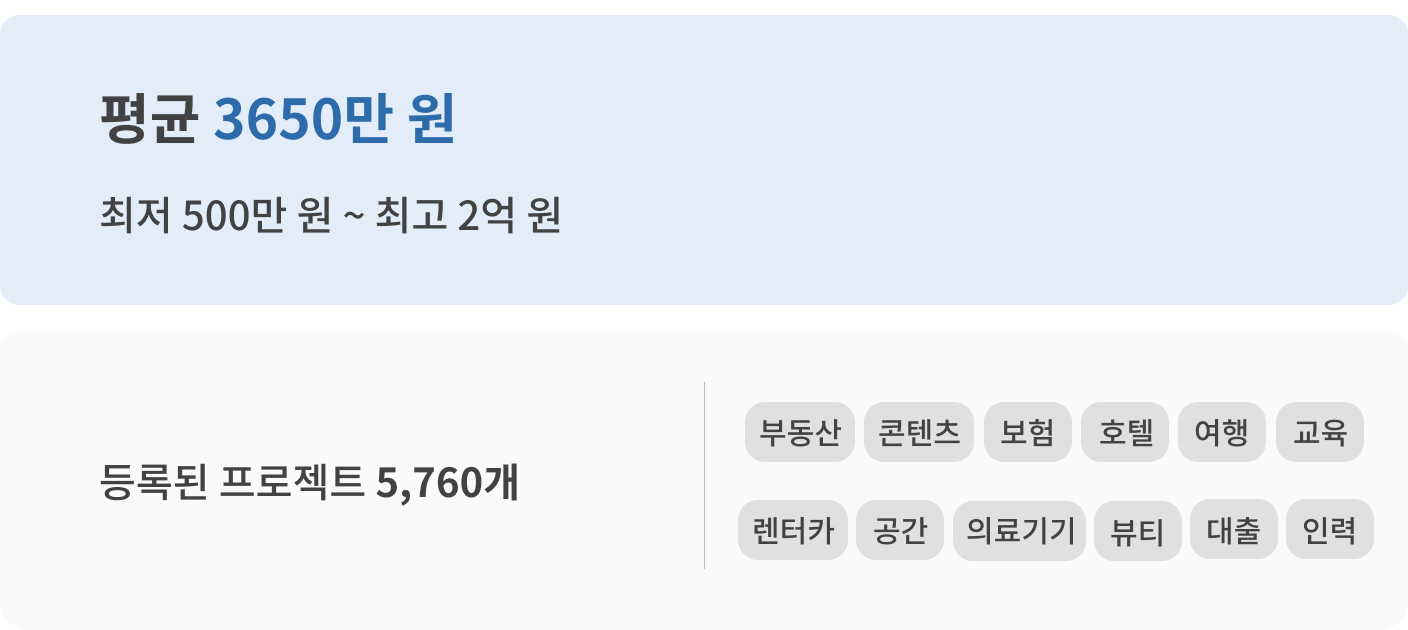 국내 1위 IT 전문가 매칭 플랫폼 위시켓 데이터에 따르면, 중개 플랫폼 개발 평균 견적은 3650만 원입니다. 최저 비용은 500만 원, 최고 비용은 2억 원으로 집계되었습니다.