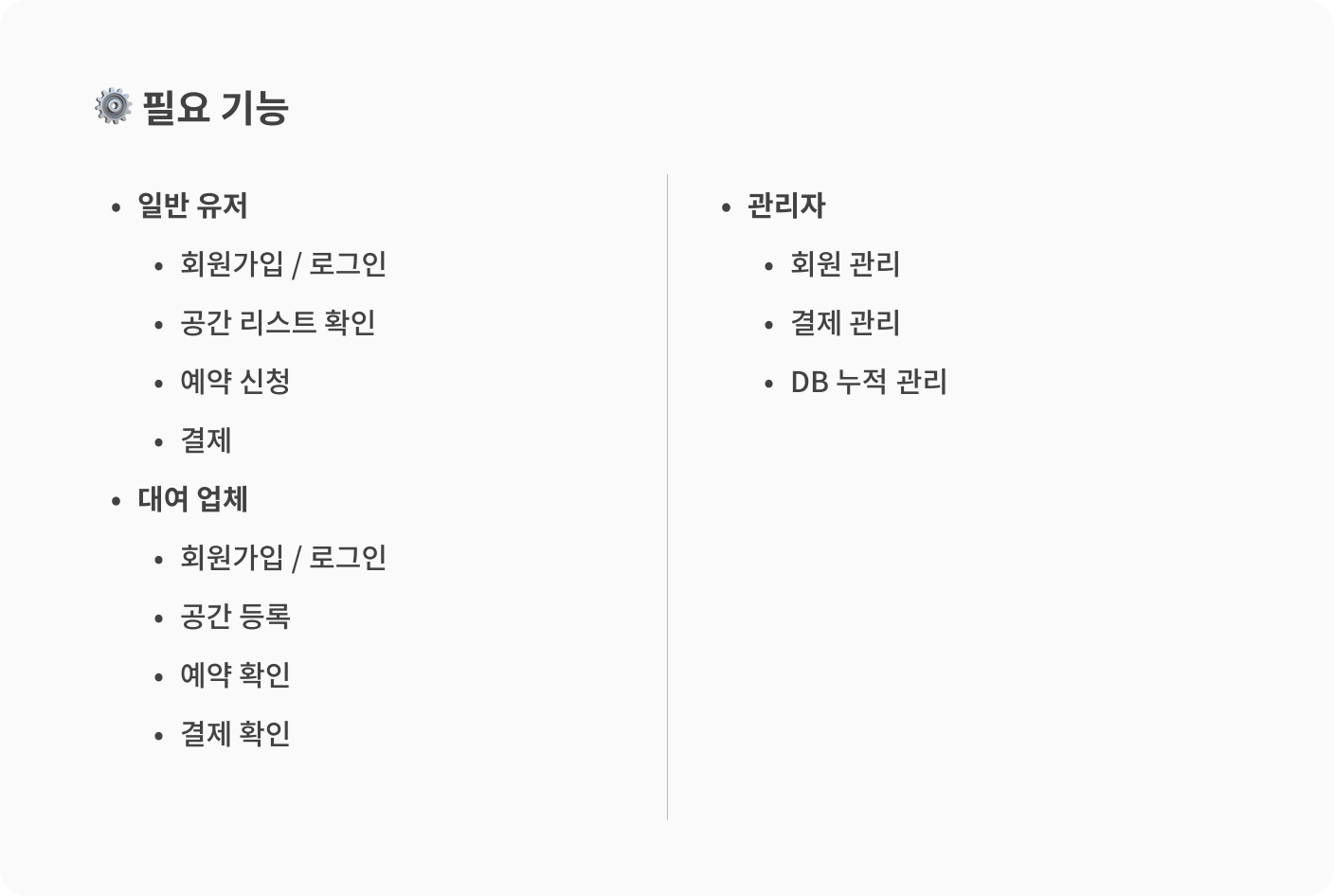 이 프로젝트는 MVP 형태로 제작한 후 빠르게 배포하는 것이 목표였습니다. 때문에 시장 가능성 검증에 필요한 ‘공간 리스트업’과 ‘예약 신청’에만 집중한 서비스를 만들고자 했습니다.