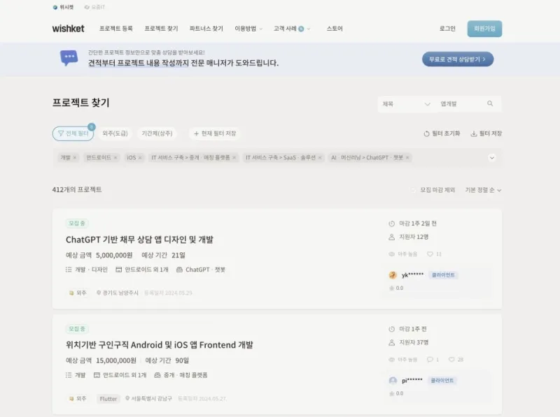 안정화는 좋은 사람, 좋은 파트너사과 함께 만듭니다. 이를 알기에 위시켓은 2012년부터 IT 분야, 특히 앱개발이 필요한 회사와 개발 전문업체와의 좋은 만남을 연결하고 있습니다. 나아가 연결 과정에 머물지 않고, 진행 과정까지 함께 해 완성도 높은 프로덕트 개발/운영에 도움을 드리는 중입니다. 아래 링크에서 대기업과 유니콘 기업들이 쓰는 국내 1위 IT 아웃소싱 플랫폼 위시켓이 어떤 곳인지 살펴보세요.